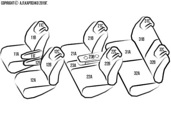 | Особенности | Требуется изготовление отверстия для подлокотников первого ряда по месту установки. Третий ряд делится в пропорции 50/50, сиденье второго ряда делится в пропорции 40/20/40. | ||
